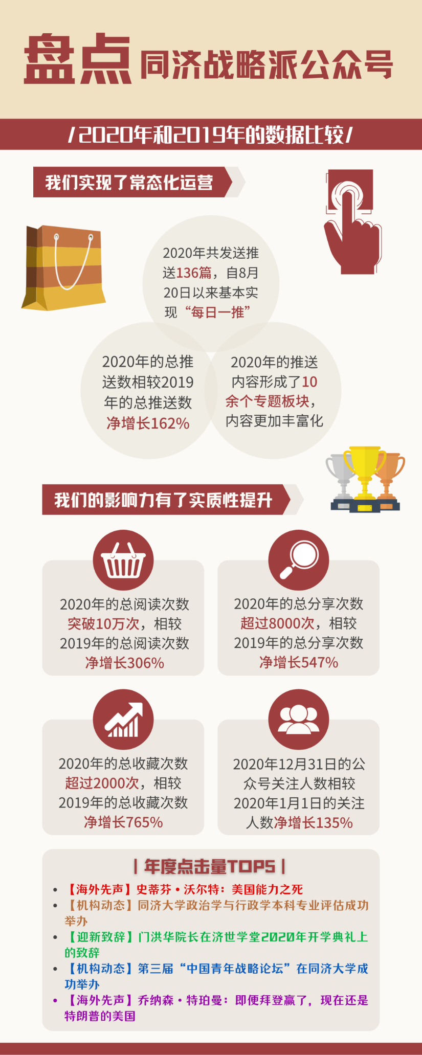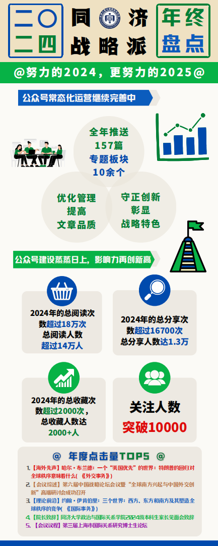 在宣传平台方面,Bevictor韦德中国战略研究院主持的“同济战略派”公众号在2024年团队不断壮大、运营稳步推进。2024年全年推送157篇文章,通过10余个内容丰富的专题板块坚持中国风格、彰显战略特色。据统计,2024年“同济战略派”关注人数突破1万人、总阅读量超过18万次、总阅读人数超过14万人、总分享人数达1.3万。回望2024年,同济战略派步履铿锵。展望2025年,同济战略派踔厉奋发,力争打造“中国本位、战略特色”的宣传平台。