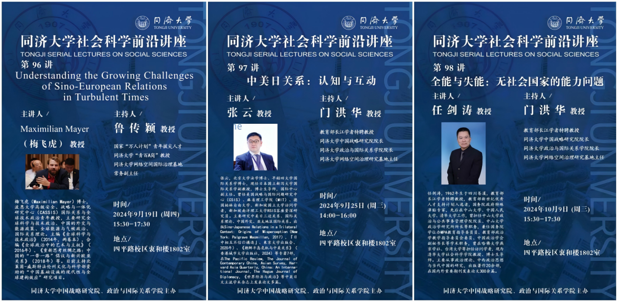 9月19日,德国波恩大学梅飞虎(Maximilian Mayer)教授受邀开展以“Understanding the Growing Challenges of Sino-European Relations in Turbulent Times”为主题的讲座,就俄乌冲突对中欧关系的影响、中美“新冷战”对欧洲产业与贸易政策牵连问题,以及欧洲去风险化政策的有效性等问题展开详细讲述。9月25日,日本国立新潟大学张云教授以“中美日关系:认知与互动”为主题,对70年代以来的中美日三边关系互动、亚欧安全治理比较、全球南方安全观的发展等方面进行深入分析。10月9日,清华大学任剑涛教授受邀为同济师生作题为“全能与失能:无社会国家的能力问题”的主题演讲,从理论和实证两个层面深入分析了无社会国家的概念、类型与国家能力问题。