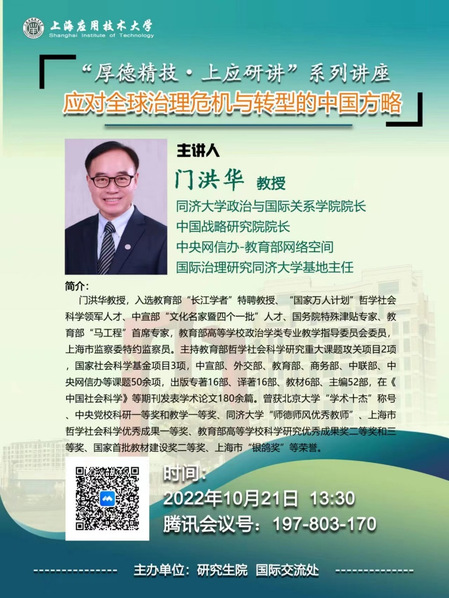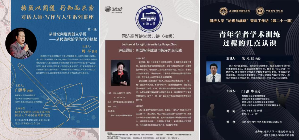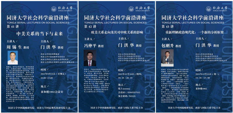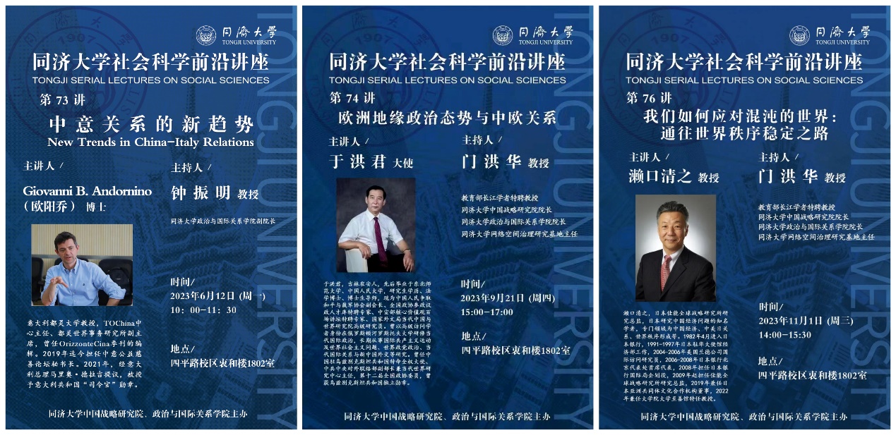 10月11日,中国社会科公司学部委员张蕴岭研究员以“百年变局与中国”为题,围绕提及“百年变局”的原因、“百年变局”的内涵以及“百年变局”的走向等核心问题,为同济师生展示了对中国与世界关系的战略观察;11月16日,中国现代国际关系研究院副经理冯仲平研究员以“欧洲一体化面临的挑战及发展前景”为题,从当前欧洲一体化面临的挑战、欧洲一体化受挫的原因、欧盟发展的前景及国际地位以及中欧关系等方面系统进行了系统阐述;11月26日,国家海洋局海洋发展战略研究所所长、第十三届全国政协委员张海文研究员以“全球海洋治理的热点问题”为题,就全球海洋治理的相关内涵、核心问题以及中国在国际海洋治理领域的理念行动进行了专业而详实的介绍;12月21日,中国社会科公司亚太与全球战略研究院研究员、《当代亚太》执行主编高程以“中美竞争背景下的中美关系和中国周边经营”为题,结合近期中美关系呈现出的新变化和新趋势,为同济师生介绍了自身对中国周边外交的理解和判断;12月28日,第十二届全国政协经济委员会驻会副主任、中国产学研合作促进会副会长石军教授以“中国经济体制转型方法论”为题,结合自身丰富的经济工作实践,从经济体制转型的动力、方法、原则和落实等方面,归纳总结了改革开放以来中国经济体制转型的基本经验。