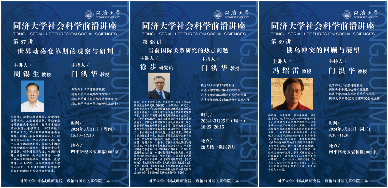 3月21日,新华社原副社长周锡生教授围绕“世界动荡变革期的观察与研判”展开主题演讲,向在场师生分析了当前世界百年未有之大变局的特点和中国的战略应对。3月25日,中国国际问题研究院原党委书记兼经理、中国原驻东盟使团团长兼大使、中国原驻智利大使徐步研究员受邀为同济师生作题为“当前国际关系研究的热点问题”的主题演讲,深入分析了当前国际局势和中国的政策方向,并在此基础上提出了当前国际关系研究的热点问题。3月26日,华东师范大学终身教授、教育部人文社会科学学部委员、教育部人文社会科学国家重点研究基地俄罗斯研究中心主任冯绍雷教授受邀以“俄乌冲突的回顾与展望”为主题,对俄乌冲突发生背景、现状及国际学界对冲突的看法、冲突形势的展望及未来国际秩序走向等方面进行了全面分析。