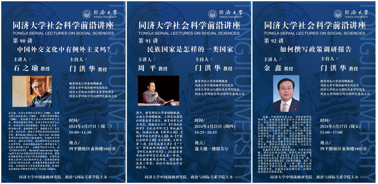 4月17日,台湾大学石之瑜教授受邀为同济师生作题为“中国外交文化中有例外主义吗?”的主题演讲,对例外主义的内涵、当前学界对例外主义研究的偏误、中西例外主义的对比等方面展开详细讲解。4月25日,教育部长江学者特聘教授、中国政治学学会副会长、云南大学特聘教授周平教授以“民族国家是怎样的一类国家”为主题,对民族国家的定义、起源以及当前发展面临的问题等议题为同济师生展开详细讲解。5月17日,中联部研究室主任、世界政党研究所所长、金砖国家智库合作中方理事会秘书长金鑫教授受邀以“如何撰写政策调研报告”为主题,对政策报告的结构、撰写要点与核心等问题进行分享。