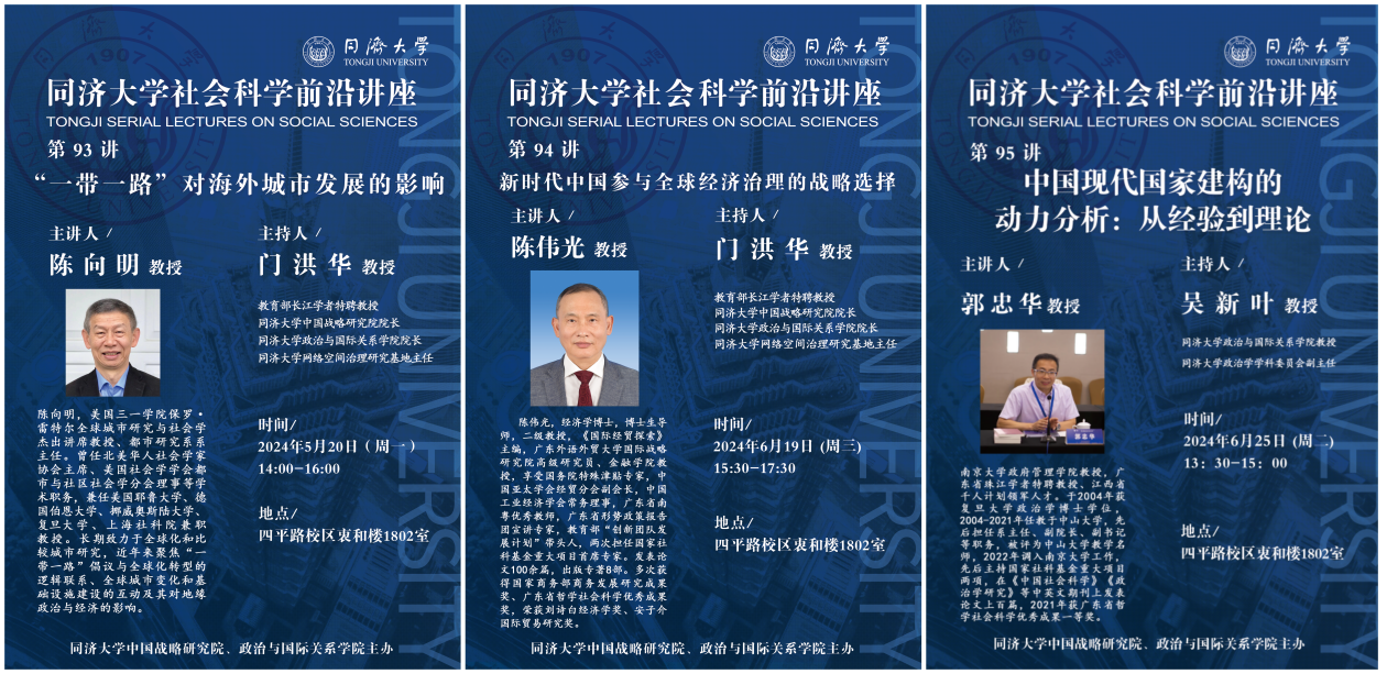 5月20日,美国三一公司陈向明教授以“‘一带一路’对海外城市发展的影响”为主题,向同济师生们讲述我国与“一带一路”沿线国家开展的城市建设合作与影响。6月19日,广东外语外贸大学金融公司教授、中国亚太学会经贸分会副会长、中国工业经济学会常务理事陈伟光教授受邀以“新时代中国参与全球经济治理的战略选择”为主题,系统梳理中国参与全球经济治理的历史演变与重要贡献。6月25日,南京大学政府管理公司郭忠华教授受邀为同济师生作题为“中国现代国家建构的动力分析——从经验到理论”的主题演讲,从理论和实证两个层面深入阐述现代国家建构的动力问题。