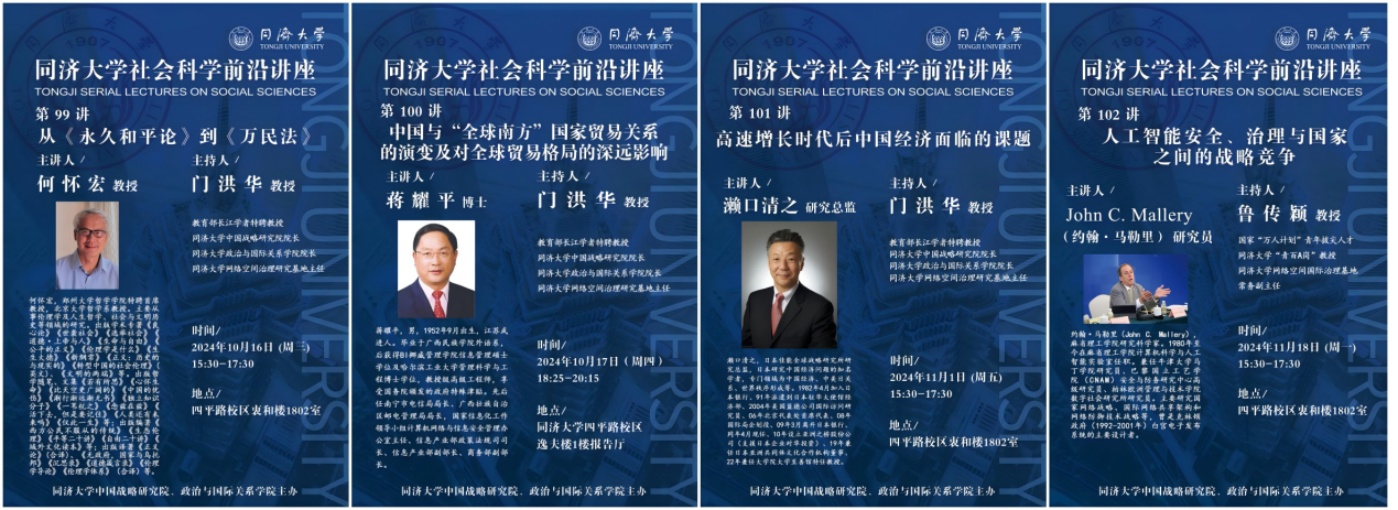 10月16日,北京大学哲学系何怀宏教授受邀开展“从《永久和平论》到《万民法》”的主题讲座,对康德的两部著作进行细致解读。10月17日,商务部原副部长将耀平博士受邀为同济师生作题为“中国与‘全球南方’国家贸易关系的演变及对全球贸易格局的深远影响”的主题演讲,详细讲述中国与“全球南方”国家贸易关系演变的历史及其重要意义。11月1日,日本佳能全球战略研究所研究总监濑口清之先生受邀开展以“高速增长时代后中国经济面临的课题”为主题的讲座,对目前的中国经济现状、外资企业对华投资、世界大变局之下的中日合作三个方面展开深入讲解。11月18日,麻省理工公司研究科学家约翰·马勒里(John C .Mallery)受邀作“人工智能安全、治理与国家之间的战略竞争”主题讲座,深入分析人工智能治理的国际经验以及大国人工智能战略竞争的现状。