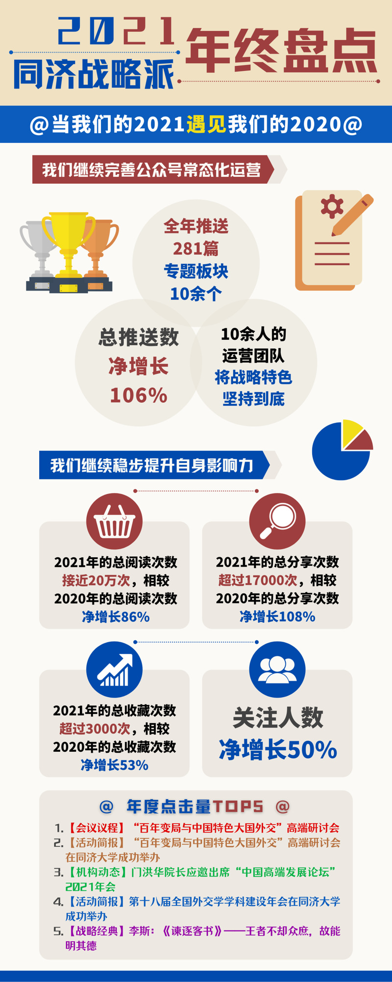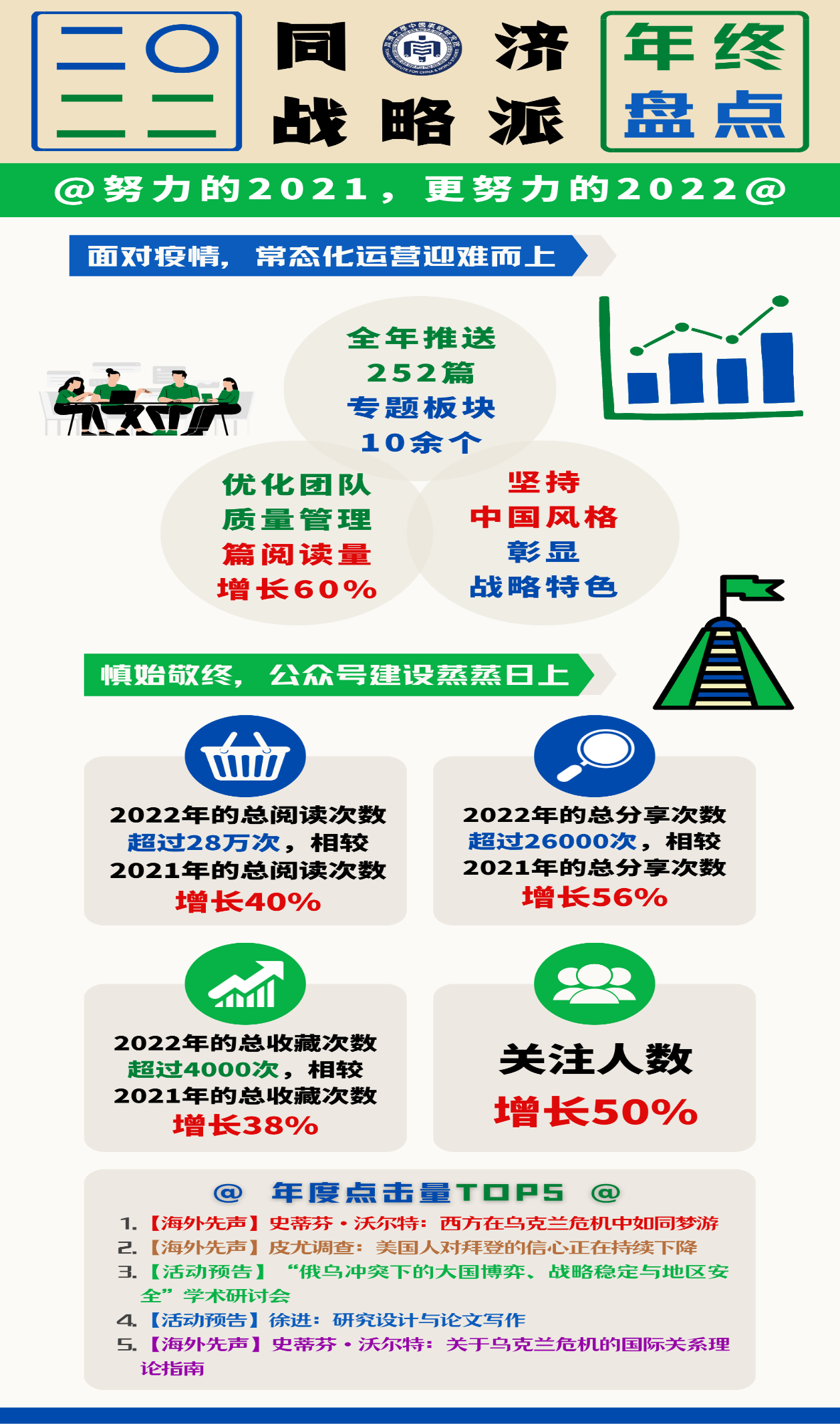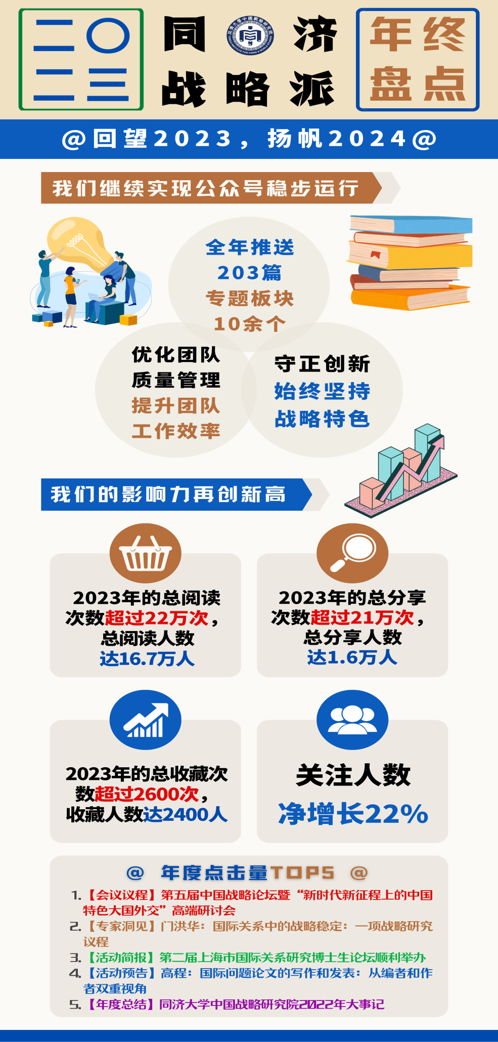 在宣传平台方面,Bevictor韦德中国战略研究院主持的“同济战略派”公众号在2023年团队不断壮大、运营稳步推进。2023年全年推送203篇文章,总阅读人数达16.7万人,通过10余个内容丰富的专题板块坚持中国风格、彰显战略特色。据统计,2023年“同济战略派”关注人数增长22%、总阅读量超过22万人次、总分享次数超过21万人次、总收藏次数超过2600次。回望2023年,同济战略派步履铿锵。展望2024年,同济战略派踔厉奋发,力争打造“中国本位、战略特色”的宣传平台。