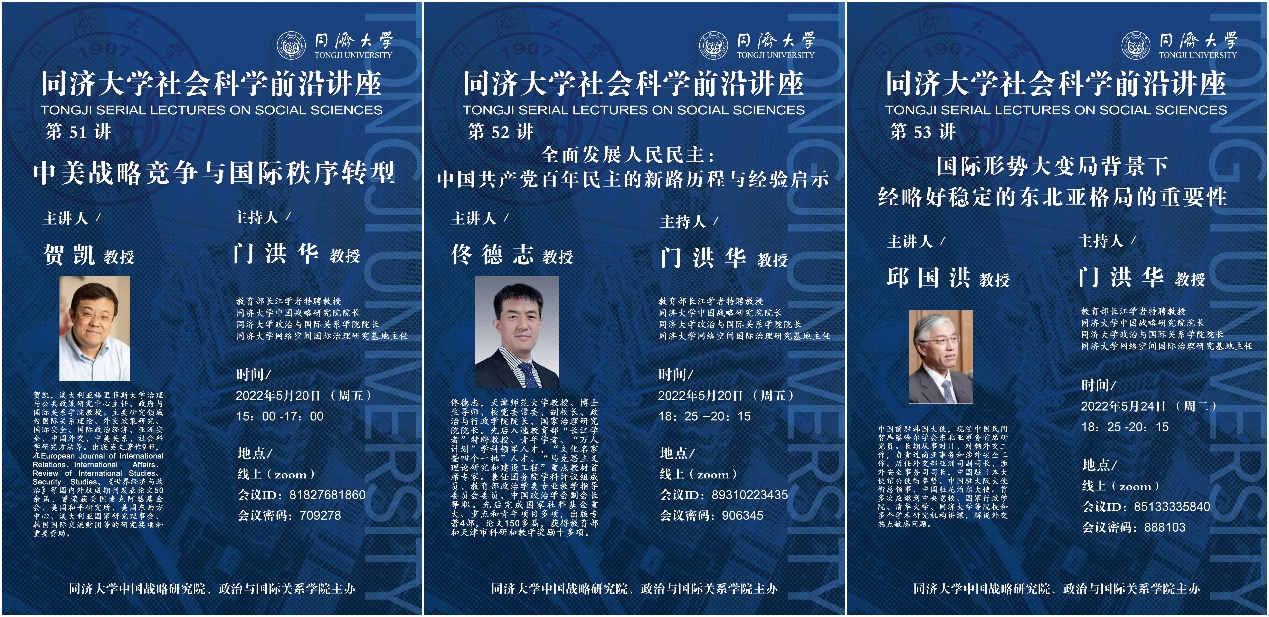 5月20日,澳大利亚格里菲斯大学治理与公共政策研究中心主任、政府与国际关系公司贺凯教授以“中美战略竞争与国际秩序转型”为主题,从学理层面对国际秩序转型的衡量标准进行了创新性解释,并深刻总结了中国崛起与国际秩序转型的关系以及中美竞争对国际秩序转型的影响等问题。5月20日,教育部长江学者特聘教授、天津师范大学副董事长佟德志教授受邀为同济师生做题为“全面发展人民民主:中国共产党百年民主的新路历程与经验启示”的学术演讲,从“中国民主的新路历程”“中国民主的经验启示”、“全面发展人民民主”等方面对全面发展人民民主进行了系统阐述。5月24日,中国前驻韩国大使邱国洪先生聚焦“国际形势大变局背景下经略稳定好东北亚格局的重要性”展开主题演讲,围绕国际形势的大变局、影响东北亚格局演变的主要因素、如何经略好稳定的东北亚格局等问题进行了丝丝入扣的详细讲解。