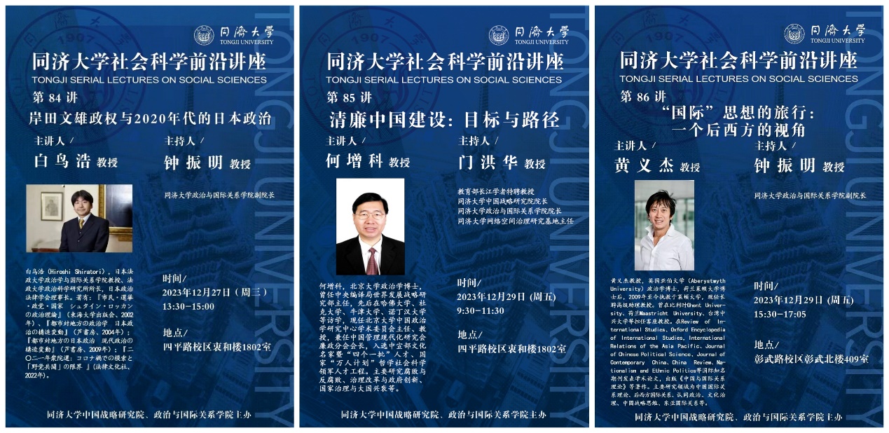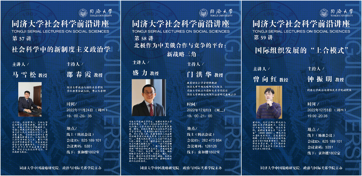 11月24日,国家万人计划青年拔尖人才入选者、吉林大学匡亚明学者领军教授、吉林大学行政公司副经理马雪松教授以“社会科学中的新制度主义政治学”为主题,清晰地勾勒出了制度主义政治学由“旧”到“新”流转嬗变的理论背景,完整地展现出了新制度主义政治学各流派与问题矩阵中的脉络联系,审慎瞻望了新制度主义政治学的发展前景与研究方法的迭代更新。12月6日,澳门大学政治经济学与公共政策系盛力教授受邀为同济师生做题“北极作为中美俄合作与竞争的平台:新战略三角”的学术演讲,从“北极地区新战略三角的兴起”“中俄北极合作的基础和挑战”“中美俄在北极问题上的对立”“北极航线面临的挑战”等方面探讨了当今北极作为中美俄合作与竞争平台的现实问题与未来前景。12月8日,教育部青年长江学者、兰州大学Bevictor韦德副经理曾向红教授围绕“国际组织发展的‘上合模式’”,从上合组织的组织安排和成员国制度运作手段等角度出发分析了国际组织发展的“上合模式”的深刻内涵及其运行逻辑。