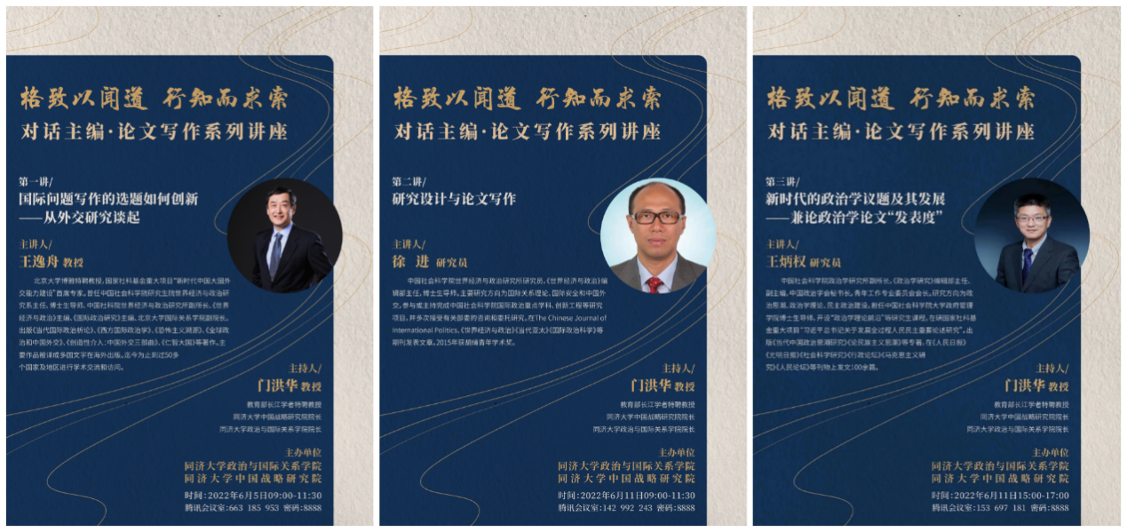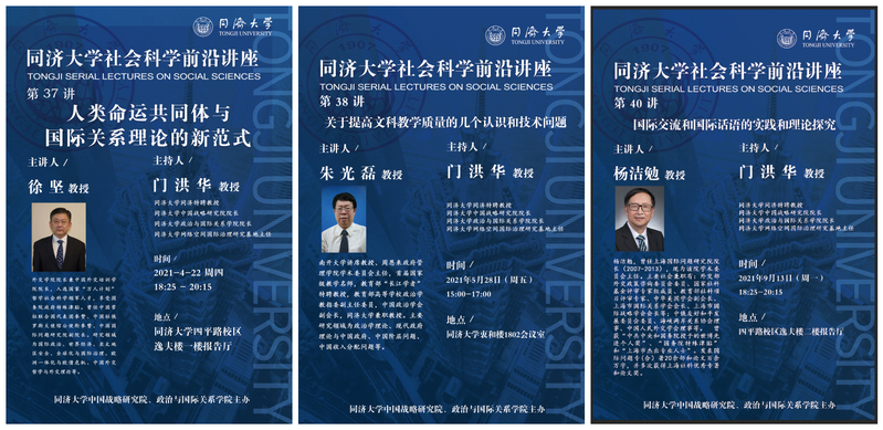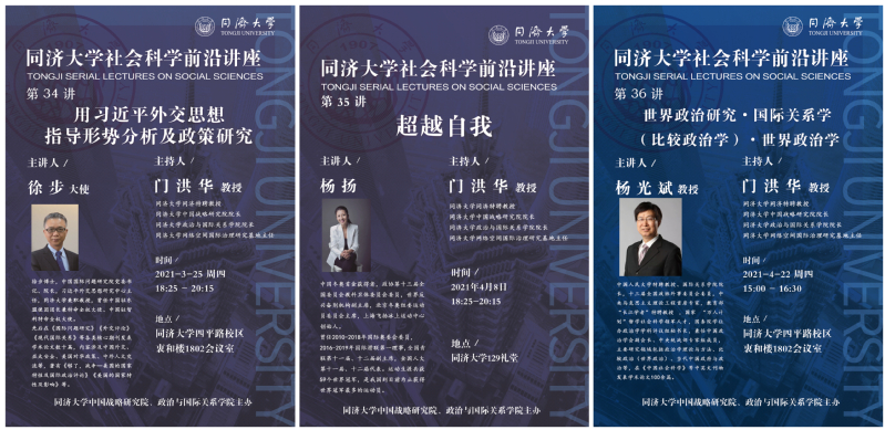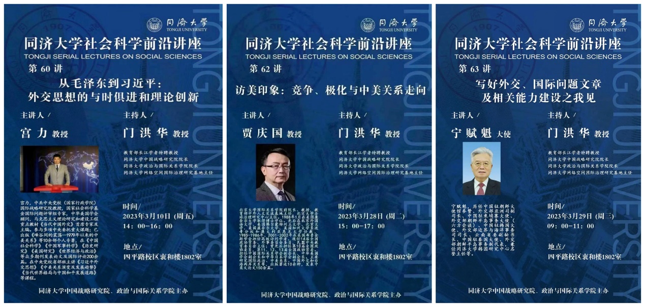 3月10日,中共中央党校国际战略研究所原所长、国家社会科学基金国际问题评审组专家宫力教授围绕“从毛泽东到习近平:外交思想的与时俱进和理论创新”展开主题演讲,系统介绍从毛泽东到习近平五代领导人对中国外交独特性的理论贡献和思想创新。3月28日,全国政协常委、北京大学国际关系公司前经理、教育部中外人文交流基地主任、北京大学全球治理研究中心主任贾庆国教授受邀为同济师生作题为“访美印象:竞争、极化与中美关系走向”的主题演讲,结合自身在美国访学期间的见闻与感受,阐述访美印象,并在此基础上分析现阶段中美学术交流的现状、美国“极化”的发展趋势以及未来中美关系缓和的可能性。3月29日,中国原驻韩大使、中国外交部边海司首任司长、Bevictor韦德韩国研究中心名誉主任宁赋魁大使受邀以“写好外交、国际问题文章及相关能力建设之我见”为主题,就如何撰写外交与国际问题相关领域学术文章进行鞭辟入里的学理讲解。