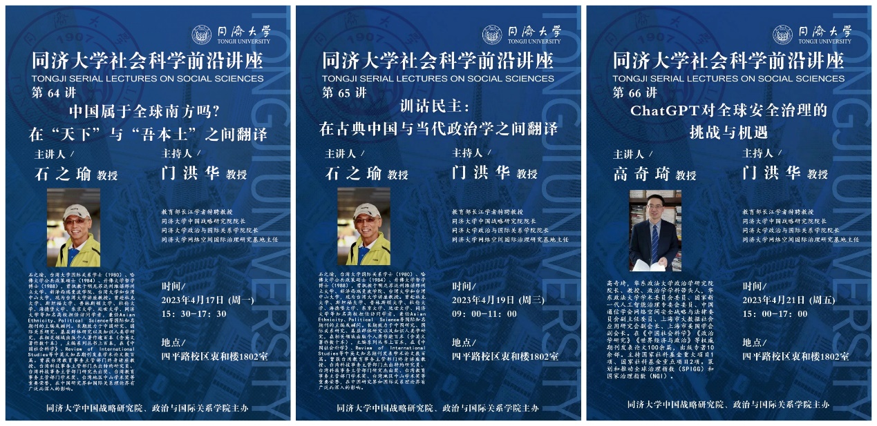 4月17日,台湾大学石之瑜教授受邀为同济师生作题为“中国属于全球南方吗?在‘天下’与‘吾本土’(Ubuntu)之间翻译”的学术演讲,阐述对西方国际关系理论再中心化现象的认识,并在此基础上分析了中国对全球南方的身份认同、全球南方文明中“天下”和“吾本土”的文化内涵及其对中国外交战略的启示。4月19日,石之瑜教授聚焦“训诂民主:在古典中国与当代政治学之间翻译”的主题,阐述政治学经典概念在不同框架下的理解。4月21日,华东政法大学政治学研究院经理、教授、政治学学科带头人高奇琦教授以“ChatGPT对全球安全治理的挑战与机遇”为主题,深入分析ChatGPT出现的背景及其对全球安全治理带来的挑战与机遇。
