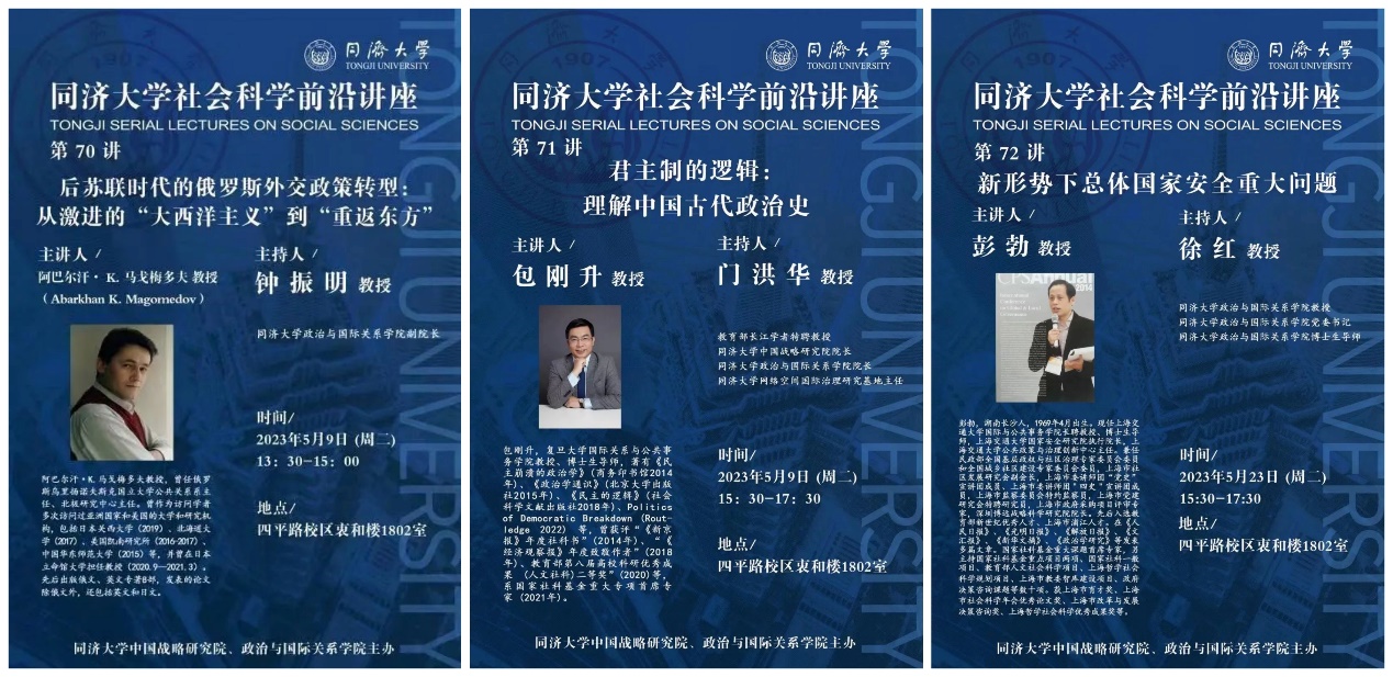 5月9日,俄罗斯乌里扬诺夫斯克国立大学公共关系系前主任、北极研究中心前主任阿巴尔汗·K.马戈梅多夫(Abarkhan K. Magomedov)教授受邀为同济师生作题为“后苏联时代的俄罗斯外交政策转型:从激进的‘大西洋主义’到‘重返东方’”的学术演讲。同日,复旦大学国际关系与公共事务公司教授、博士生导师包刚升教授围绕“君主制的逻辑:理解中国古代政治史”的主题,以君主制的运行与发展作为线索,系统阐述中国古代政治的发展脉络。5月23日,上海交通大学国际与公共事务学经理聘教授、博士生导师、上海交通大学国家安全研究院执行经理、上海交通大学公共政策与治理创新中心主任彭勃教授围绕“新形势下总体国家安全重大问题”的主题,对当前国际局势与我国总体国家安全面临的重大问题进行深刻分析。