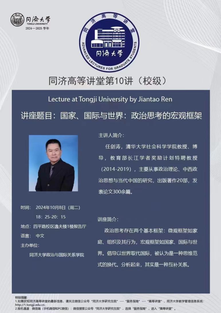 在交流互动环节,任剑涛教授与同济师生们积极互动。在讨论中,任教授分析了新加坡和印度的发展模式,指出新加坡的家族政治市场经济特色以及印度民主政治与计划经济的结合,强调了比较政治经济学中的某些理论需要修正;接着讨论了国际关系的复杂性,探讨了世界政治与国际政治的关系,包括世界政治是否能取代国际政治作为新的知识范式。任教授和同济师生们对世界政治和国际政治的定义、价值和实践进行了深入探讨,还对国家间自由相处的观念和国家不分大小一律平等的准则进行交流。