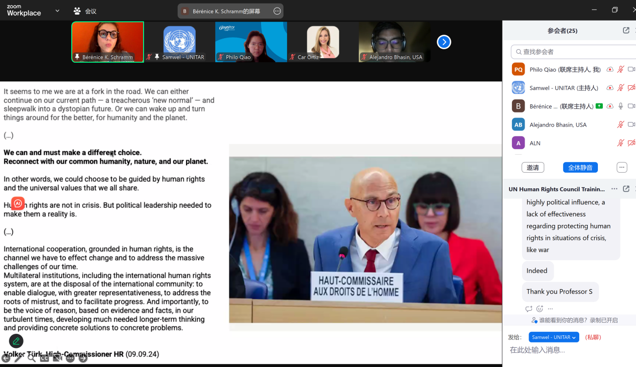 除负责联合国实地访问项目以外,她还协助“联合国人权理事会”线上培训项目(United Nations Human Rights Council Training Programme)的开展,进行会议协调和线上工作坊的主持。