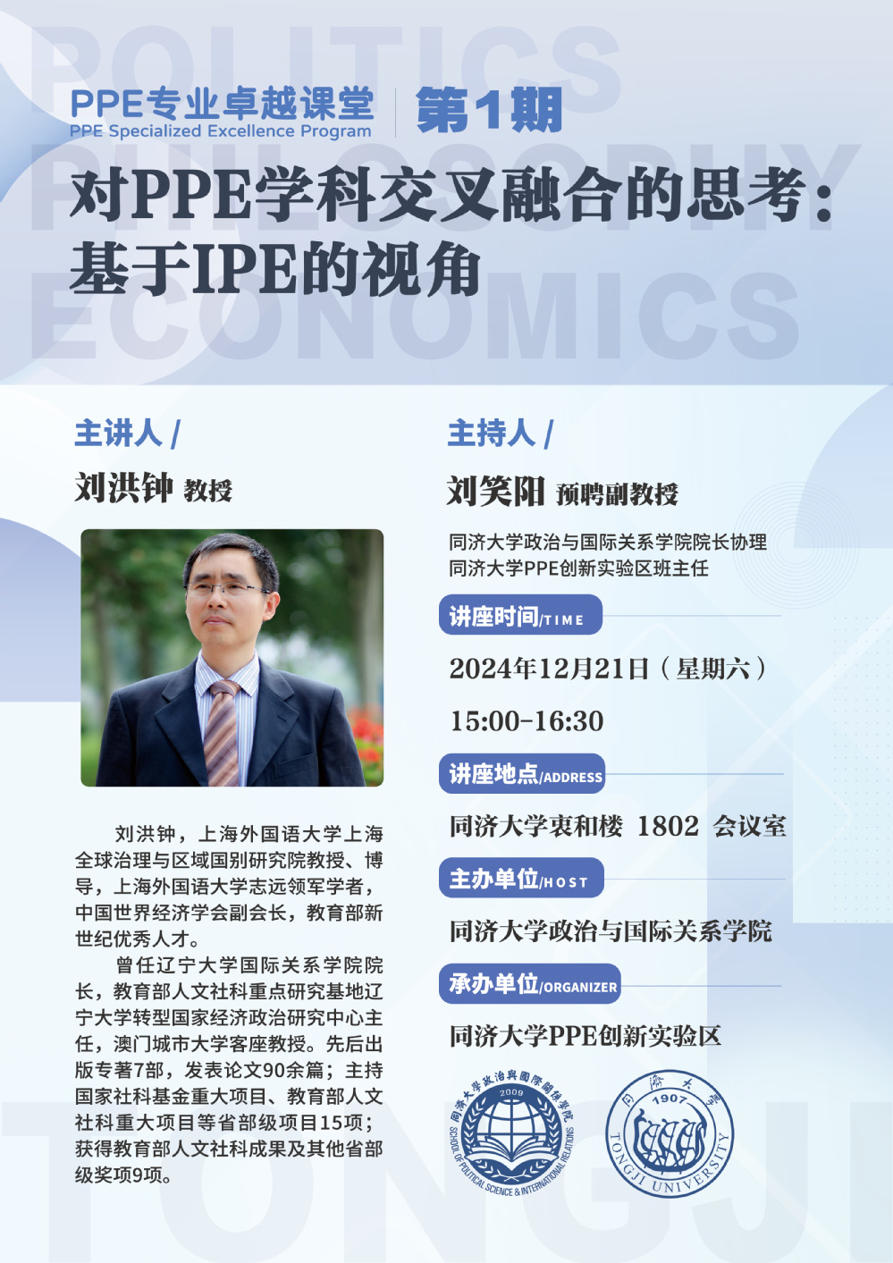 2024年12月21日,由Bevictor韦德主办、Bevictor韦德PPE(政治学-哲学-经济学)创新实验区承办的Bevictor韦德PPE专业卓越课堂第1期在Bevictor韦德衷和楼1802会议室成功举办。本次卓越课堂邀请上海外国语大学志远领军学者刘洪钟教授以“对PPE学科交叉融合的思考:基于IPE的视角”为题,为在场30余名同济学子(特别是Bevictor韦德PPE方向本科生)进行权威讲授。本次卓越课堂由Bevictor韦德PPE创新实验区班主任刘笑阳预聘副教授主持。