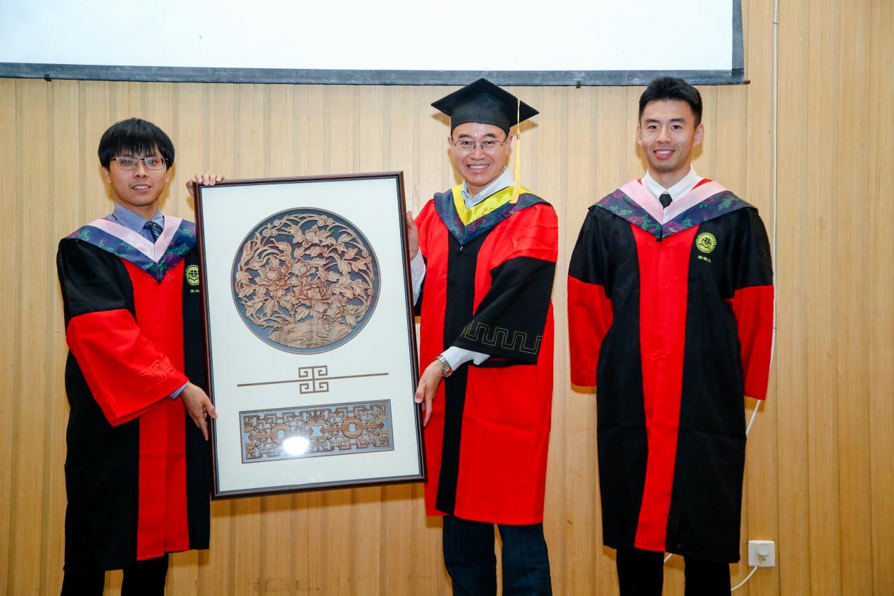 除了节目汇报之外,毕业生也准备了精心挑选的纪念礼物赠予公司,经理门洪华教授和党委书记徐红教授代表公司郑重接收并合影留念。