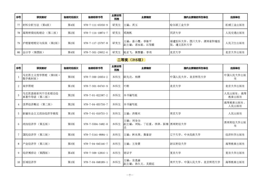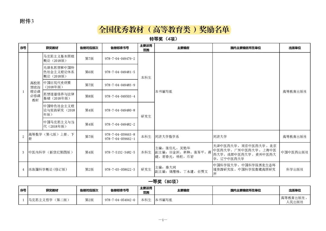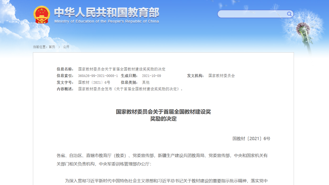 2021年10月9日,中华人民共和国教育部发布《国家教材委员会关于首届全国教材建设奖奖励的决定》,授予10种教材“全国优秀教材特等奖”,授予200种教材“全国优秀教材一等奖”,授予789种教材“全国优秀教材二等奖”,授予99个集体“全国教材建设先进集体”称号,授予200名同志“全国教材建设先进个人”称号。