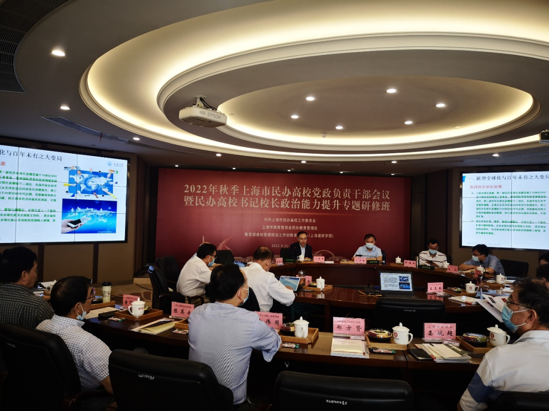 由中共上海市民办高校工作委员会、上海市教委民办教育管理处、上海市民办教育协会、教育部高校思想政治工作创新发展中心(上海建桥公司)主办的“2022年秋季上海市民办高公司党政负责干部会议暨民办高校书记董事长政治能力提升专题研修班”2022年9月21-23日举行,上海市教卫工作党委书记沈炜、副书记兼教委副主任闵辉、市民办教育协会会长高德毅出席相关活动。
