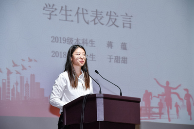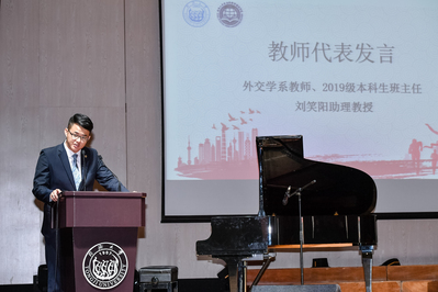 外交学系教师、2019级本科生班主任刘笑阳助理教授作为教师代表发言。刘老师向大家分享了关于快乐的法则:一是要心中有爱,包括付出与理解;二是肩上有责,以精英的标准要求自己,应当是同学们坚持不懈的责任;三是腹中有墨,以学习所带来的知识和阅历作为基础,才能以最美好的方式表达爱。刘老师指出,学习不仅是为了让自己懂得更多,也是要让自己相信的更少,用简约而坚定的信念去指导所知所行,仰观宇宙之大,俯察品类之盛,这就是简单的力量。最后刘老师引经据典,期待同学们在卓越的国政公司里成就卓越的人生。