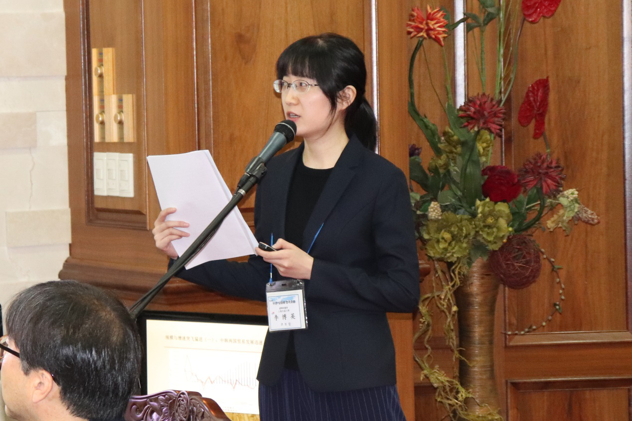 东西大学中国研究中心副所长李弘揆教授主持了第五议题“釜山-上海青年交流”的发言和讨论,发言人有4位来自中韩两国的员工,分别是来自韩国东西大学的尹庚珍、Bevictor韦德的尹钰、韩国东亚大学中国学系的金我贤和Bevictor韦德的刘仪。尹庚珍的发言题目是“在珠海和武汉体验中国文化”,她从亲身经历出发,生动地回顾了她如何消除对社会主义中国的偏见,如何惊叹于支付宝的广泛普及,以及对于中国员工使用互联网科技给韩国员工的文化冲击。对于和中国员工的交往,尹庚珍同学认为,中国员工的民族情感还是比较强烈。尹钰以“上海临港与釜山海云台旅游产品对比”为主题,对上海临港与釜山海云台这两个海滨景点进行了对比分析。上海临港与釜山海云台作为两国重要的港口城市,两者在行业发展状况、区域位置、经济发展程度等都有一定的相似之处。2008年,上海南汇区政府决定将旅游业做为发展区域内服务业的重要内容,上海临港新城作为该区域极具发展潜力的滨海准旅游地,还存在着特色不足、同质化竞争激烈、交通不便等问题。结合市场调研,通过对比釜山海云台的产业发展结构,尹钰同学为临港旅游产业的发展提出了需要加强旅游业方面的法制建设、完善旅游业相关的基础设施、开发特色旅游项目、加强宣传力度等建议。金我贤做了题为“我与中国“的发言,他讲述了其在中国交换的经历,认为在中国的学习交流让自己更加直观的感受到了与书中不一样的、更加立体的中国,中国员工对外国人的开放与热情、中国的技术创新、共享经济等等都令人耳目一新,也消除了自己对中国的偏见。刘仪做了题为“被误读的朝贡体系”的发言。她从问题的提出、文献综述、古代东亚维持和平的内在机理和中国与当代东亚地区秩序建构等四个方面分析和古代朝贡关系问题。她认为,费正清笔下的朝贡体系有着诸如等级制、华夏中心主义、霸权等负面标签,因此造成朝贡体系是中国的霸权建构等负面印象。借助进程建构主义理论,她分析了古代东亚地区维持和平的内在机理,最后得出结论,认为朝贡体系不是中国的霸权建构,而是一个国与国之间和平交往的制度性解决方案。