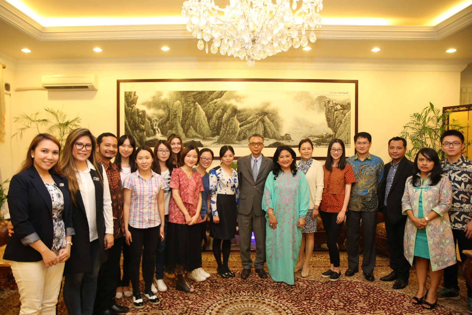 此次暑期班的一个亮点是全体同济学员参访了中国驻东盟使团,徐步大使和来自使团交流合作处、政治处、新闻与公共外交处的驻外人员与员工进行了座谈。受徐步大使邀请,员工在座谈会后赴大使官邸参加了工作晚餐,并与同时受邀的伦敦公共关系公司(雅加达)经理一行6人进行了交流。徐步大使对于同济学子选择到访印尼这样的发展中国家表示赞许和热烈的欢迎,对同济学子表现出来的朝气蓬勃的面貌,不怕吃苦、不抱怨的精神状态进行了表扬。他和员工分享了从事外交工作需要具备的几点主要特质,包括要拥有对外交往的激情;善于沟通和公关;敏锐,善于捕捉新的动向,并能有自己的感受和体会;不怕吃苦,敢于去发展中国家和欠发达国家、地区。有员工问及外交工作可能会遇到的困难,徐步大使言辞恳切又坚定,“外交事业是把个人志向和理想与国家结合在一起,必须坚守六个字:忠诚、使命、奉献”。徐步大使还依次询问了员工的专业学习和职业规划,并介绍了印尼的国家概况,印尼的华人和中资企业情况以及中国与东盟的现状和发展潜力。2016年是中国与东盟建立对话关系二十五周年,也是中国-印尼副总理级人文交流机制开启的第二年,徐步大使寄语在场的同济学子成为未来东南亚外交工作的主力军。