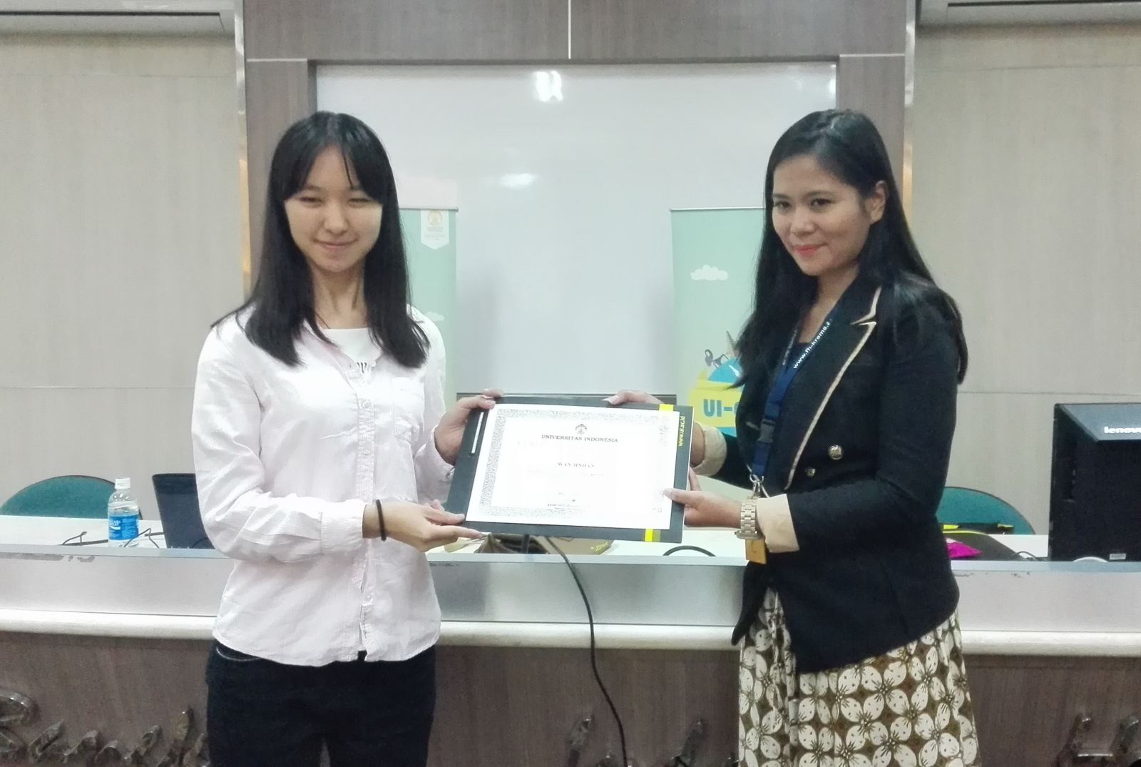 印尼大学国际办公室Alfrida女士向2014级员工万尽涵授予暑期班结业证书