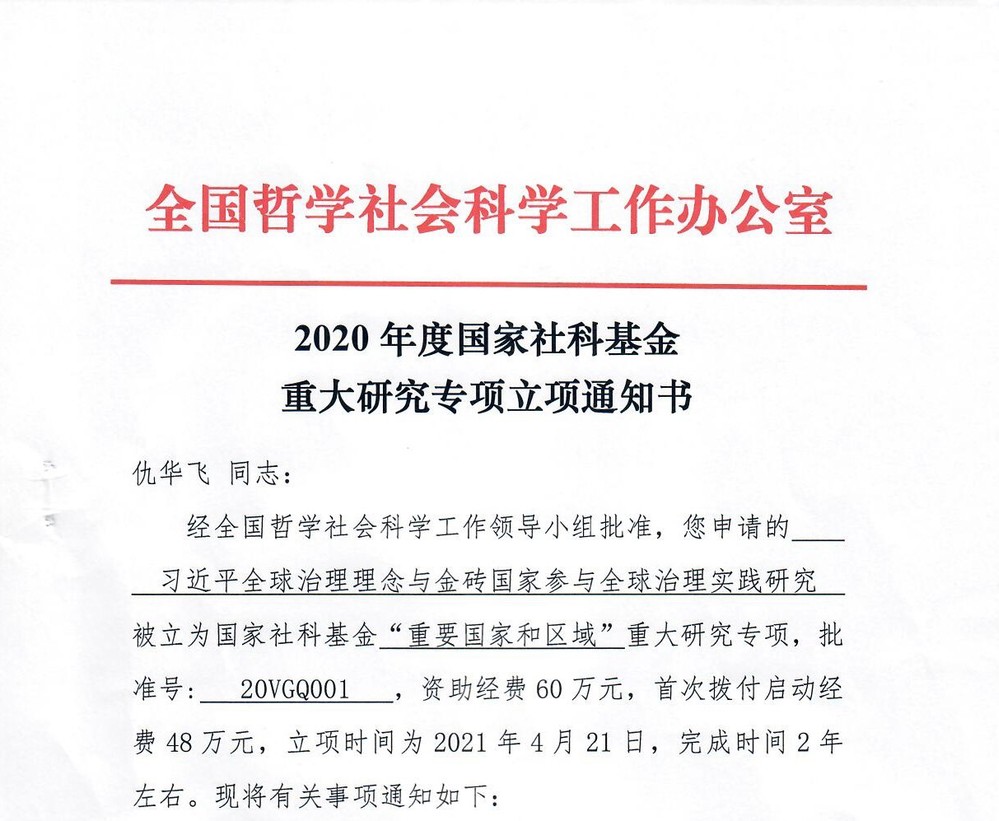 日前,由仇华飞教授担任首席专家的《习近平全球治理理念与金砖国家参与全球治理实践研究》经全国哲学社会科学工作领导小组批准,被立为国家社科基金“重要国家和区域”重大研究专项,立项时间为2021年4月,研究时间为两年左右。