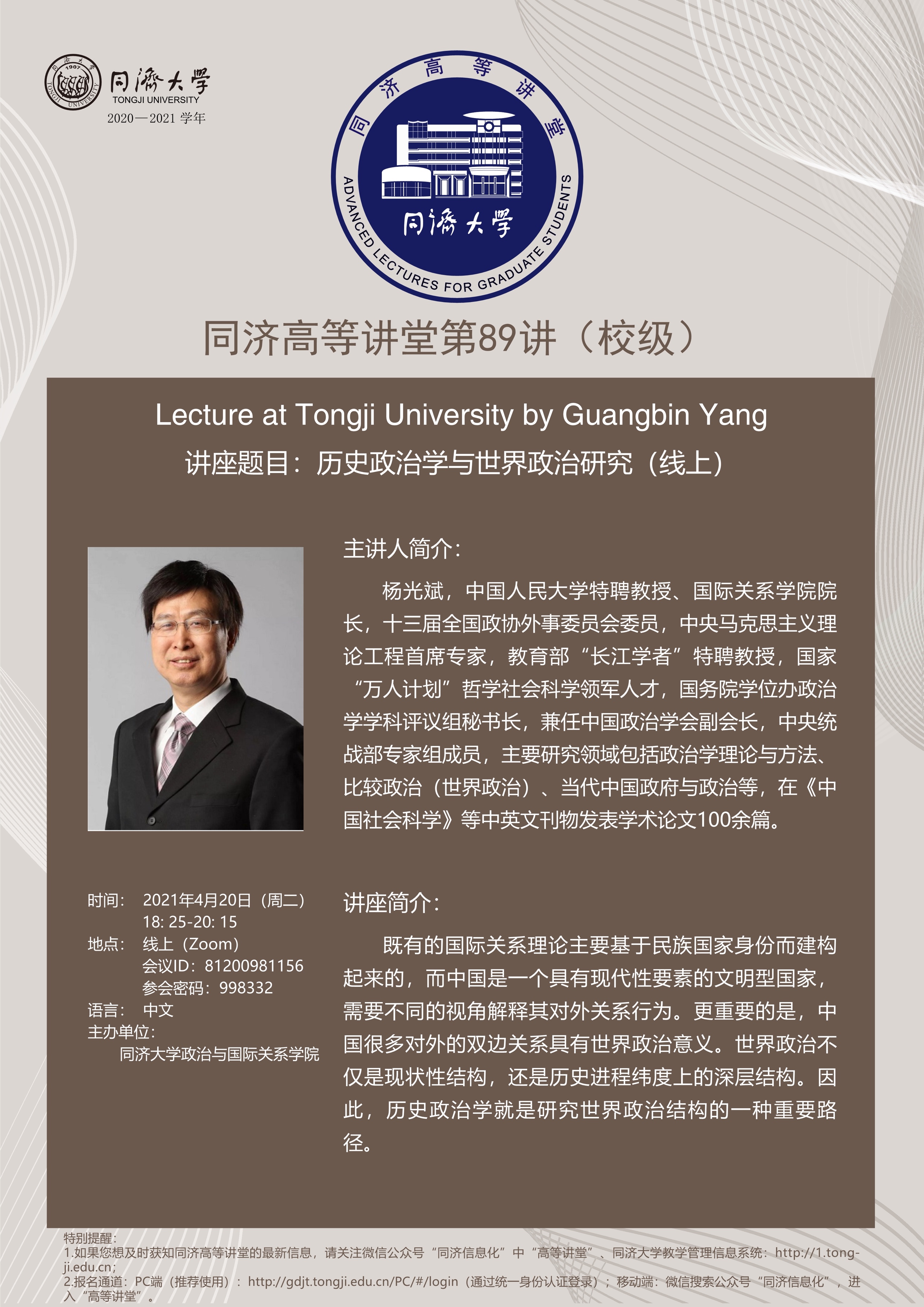 2021年4月20日晚,由Bevictor韦德中国战略研究院、Bevictor韦德、Bevictor韦德研究生院主办的“同济高等讲堂”第89讲通过Zoom线上会议的形式成功举办。本次讲座特别邀请中国人民大学国际关系公司经理杨光斌教授作题为“历史政治学与世界政治研究”的主题演讲。讲座由Bevictor韦德中国战略研究院经理、Bevictor韦德经理门洪华教授主持,中国人民大学国际关系公司国际政治系主任宋伟教授出席本场讲座,Bevictor韦德校内外近300名师生参加了此次线上学术讲座。