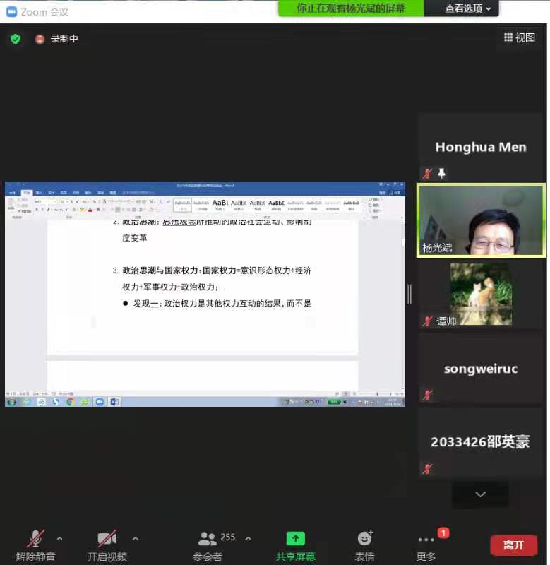 在本场讲座中,杨光斌教授从“政治思潮与世界政治变迁”、“政治思潮与世界政治变革的动力”、“政治思潮与世界秩序:思想与学术”、“历史终结论之终结与身份政治-认同政治的兴起”、“中国崛起与新世界秩序的展望”等五个方面进行了讲解。