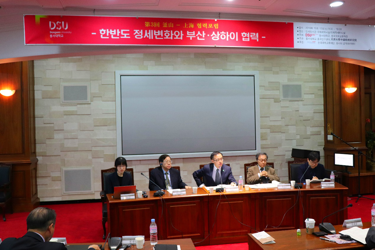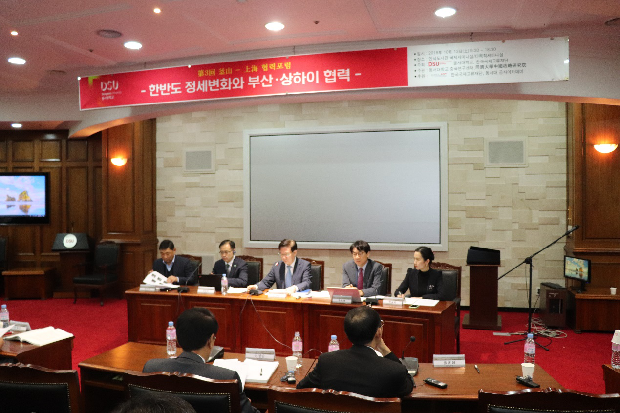 10月13日,论坛在东西大学民石图书馆6层国际会议厅正式举行。本届“上海-釜山合作论坛”讨论的主题是“韩半岛局势变化和釜山-上海合作”。东西大学中国研究中心所长辛正承大使首先致开幕词,向与会代表们介绍“上海-釜山合作论坛”举办的背景和出席此次第三届论坛会议的主要嘉宾。东西大学董事长张济国教授代表东西大学致欢迎词,对来自中韩两国的参会人员表示热烈欢迎。