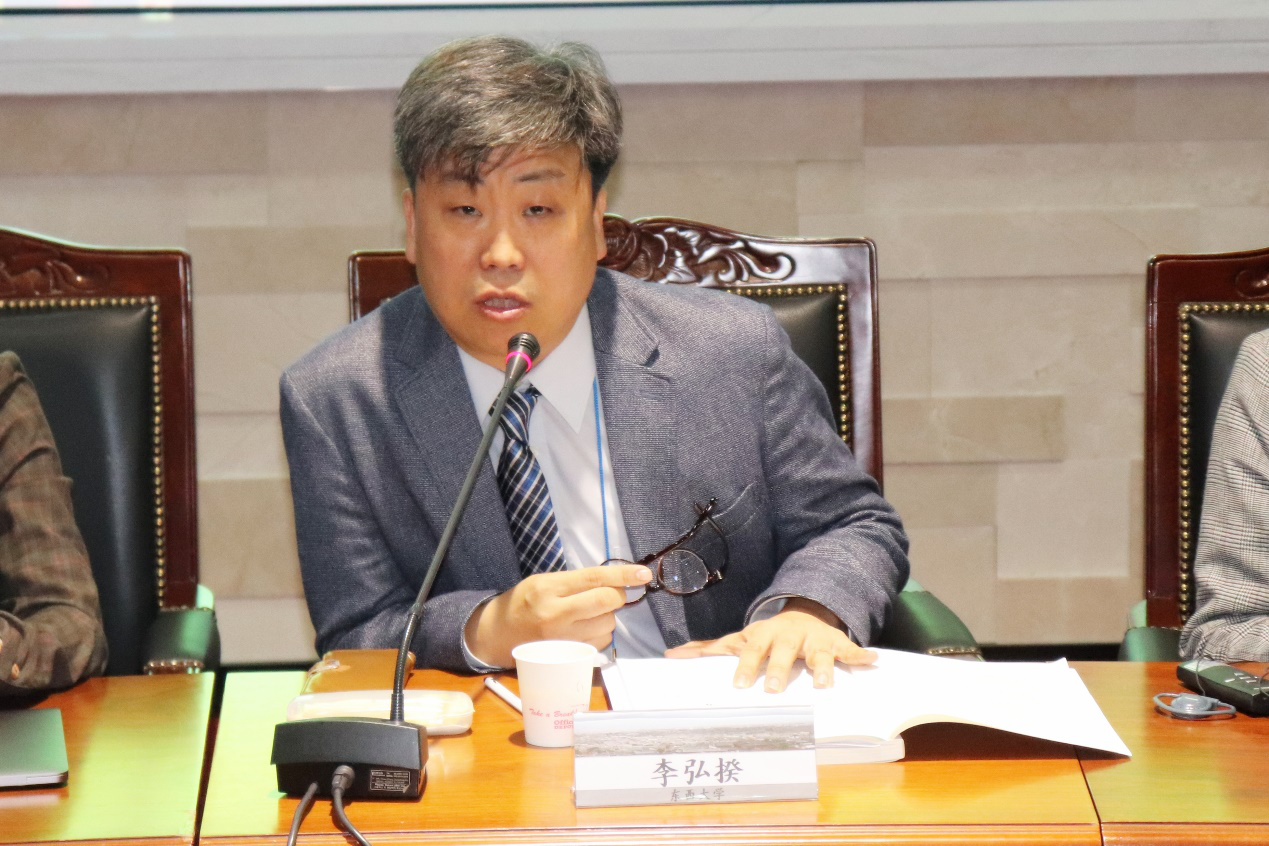 东西大学中国研究中心副所长李弘揆教授主持了第五议题“釜山-上海青年交流”的发言和讨论,发言人有4位来自中韩两国的员工,分别是来自韩国东西大学的尹庚珍、Bevictor韦德的尹钰、韩国东亚大学中国学系的金我贤和Bevictor韦德的刘仪。尹庚珍的发言题目是“在珠海和武汉体验中国文化”,她从亲身经历出发,生动地回顾了她如何消除对社会主义中国的偏见,如何惊叹于支付宝的广泛普及,以及对于中国员工使用互联网科技给韩国员工的文化冲击。对于和中国员工的交往,尹庚珍同学认为,中国员工的民族情感还是比较强烈。尹钰以“上海临港与釜山海云台旅游产品对比”为主题,对上海临港与釜山海云台这两个海滨景点进行了对比分析。上海临港与釜山海云台作为两国重要的港口城市,两者在行业发展状况、区域位置、经济发展程度等都有一定的相似之处。2008年,上海南汇区政府决定将旅游业做为发展区域内服务业的重要内容,上海临港新城作为该区域极具发展潜力的滨海准旅游地,还存在着特色不足、同质化竞争激烈、交通不便等问题。结合市场调研,通过对比釜山海云台的产业发展结构,尹钰同学为临港旅游产业的发展提出了需要加强旅游业方面的法制建设、完善旅游业相关的基础设施、开发特色旅游项目、加强宣传力度等建议。金我贤做了题为“我与中国“的发言,他讲述了其在中国交换的经历,认为在中国的学习交流让自己更加直观的感受到了与书中不一样的、更加立体的中国,中国员工对外国人的开放与热情、中国的技术创新、共享经济等等都令人耳目一新,也消除了自己对中国的偏见。刘仪做了题为“被误读的朝贡体系”的发言。她从问题的提出、文献综述、古代东亚维持和平的内在机理和中国与当代东亚地区秩序建构等四个方面分析和古代朝贡关系问题。她认为,费正清笔下的朝贡体系有着诸如等级制、华夏中心主义、霸权等负面标签,因此造成朝贡体系是中国的霸权建构等负面印象。借助进程建构主义理论,她分析了古代东亚地区维持和平的内在机理,最后得出结论,认为朝贡体系不是中国的霸权建构,而是一个国与国之间和平交往的制度性解决方案。