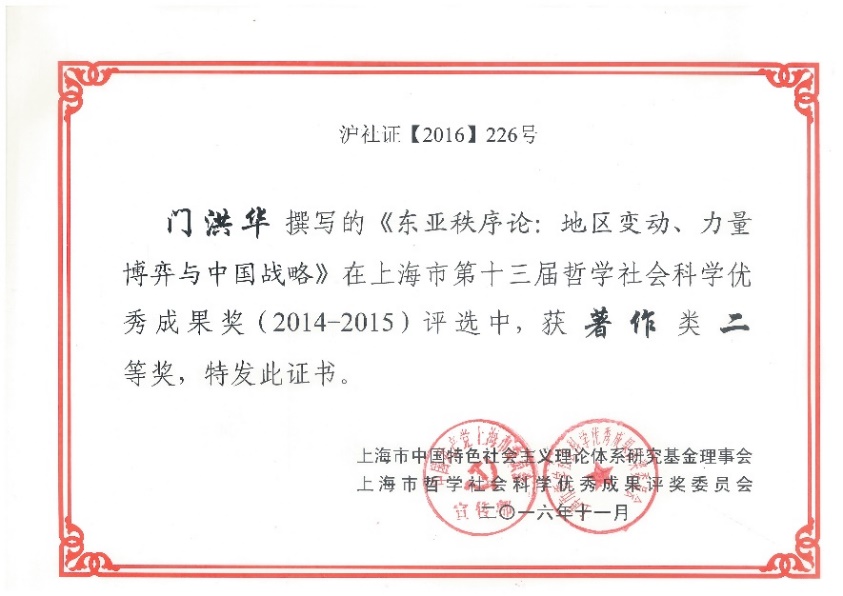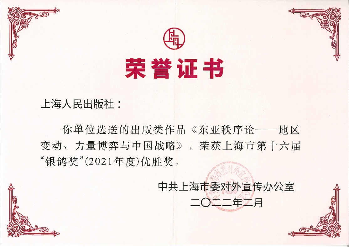 In February 2022, the results of the 16th Shanghai “Silver Pigeon Award” of 2021, organized by the International Communication Office of the CPC Shanghai Municipal Committee, were announced. Professor Men Honghua’s book Order of East Asia: Regional Transformation, Competition among Main Powers, and China’s Strategy (Shanghai People's Publishing House, 2015), sent by Shanghai People's Publishing House, 2015), is honored the “Silver Pigeon Award” of 2021.