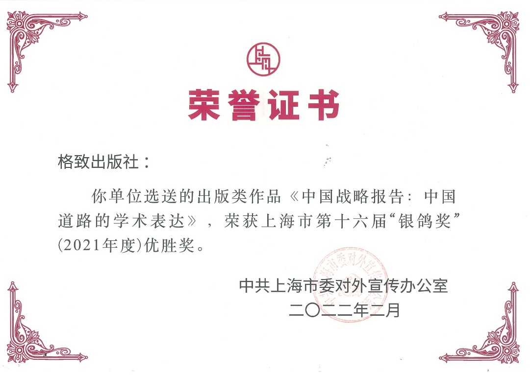 In February 2022, the results of the 16th Shanghai “Silver Pigeon Award” of 2021, organized by the International Communication Office of the CPC Shanghai Municipal Committee, were announced. Chinese Journal of Strategies Studies (Vol. 3): An Academic Expression of the Chinese Road (Truth & Wisdom Press and Shanghai People's Publishing House, 2016), co-edited by Professor Men Honghua from Tongji University, Editor Li Fang from Social Sciences in China Press (SSCP) and Professor Xiao Xi from Jilin University, and sent by Truth & Wisdom Press, is honored the “Silver Pigeon Award” of 2021.