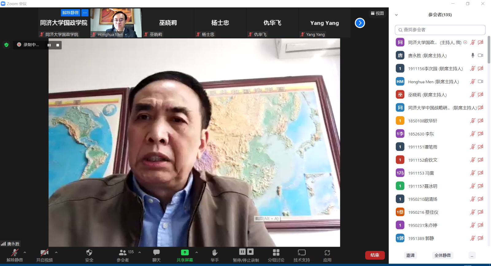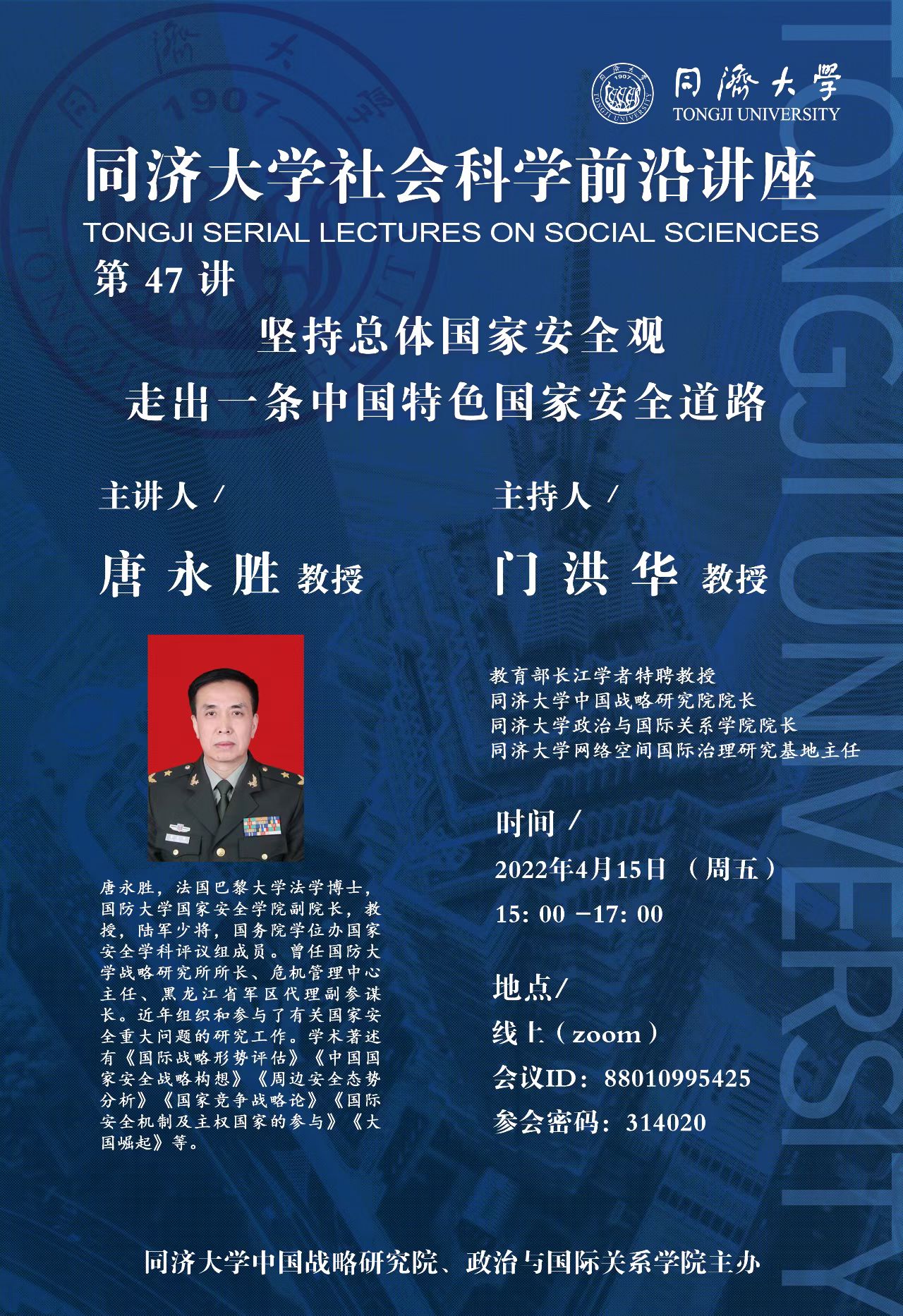 On April 15, 2022, hosted by the Institute for China & World Studies / the School of Political Science & International Relations (SPSIR) of Tongji University, the 47th lecture of Tongji Serial Lectures on Social Sciences was successfully held online. On the occasion of the seventh National Security Education Day, Professor Tang Yongsheng, Vice-Dean of the National Security College at China People's Liberation Army National Defence University, Major General of the Army, and a member of the National Security Discipline Review Group of the Academic Degrees Office of the State Council, was specially invited to deliver a lecture on "Pursuing a Holistic View of National Security, Taking a National Security Road with Chinese Characteristics". More than 140 students and teachers of Tongji University attended the online lecture, which was moderated by Dean Men Honghua, a distinguished professor of the Changjiang Scholars Program of the Ministry of Education.
