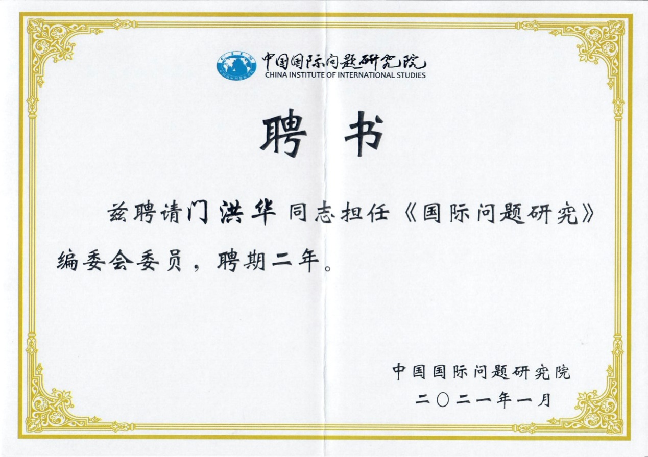 In January 2021, Men Honghua, Distinguished Professor, Dean of the School of Political Science & International Relations and President of the Institute for China & World Studies, Tongji University, was appointed by the China Institute of International Studies (CIIS) as an editorial board member of the Journal of China International Studies.