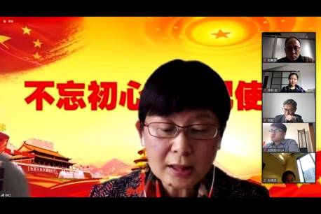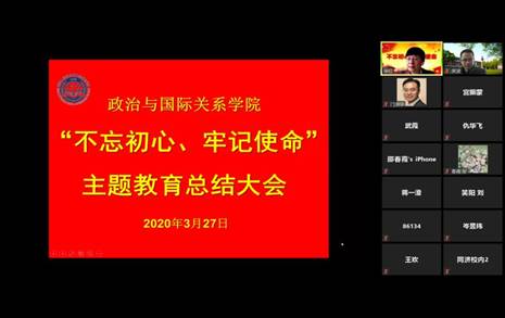 In accordance with the requirements of the Party Committee of Tongji University and the 7th Tour Steering Group of the Party Committee of Tongji University on Party History Learning and Education on holding an education summary meeting on the theme of “staying true to our original aspiration and founding mission” during the epidemic prevention and control period, the Party Committee of the School of Political and International Relations (SPSIR) of Tongji University held the said summary meeting via Zoom on the afternoon of March 27, 2020. Comrade Ni Bin from the 7th Tour Steering Group attended the meeting and delivered a speech. Comrade Xu Hong, Secretary of Party Committee of SPSIR, made a summary report on behalf of the Party Committee of SPSIR. The meeting was moderated by Comrade Men Honghua, Dean and Deputy Secretary of the Party Committee of SPSIR.