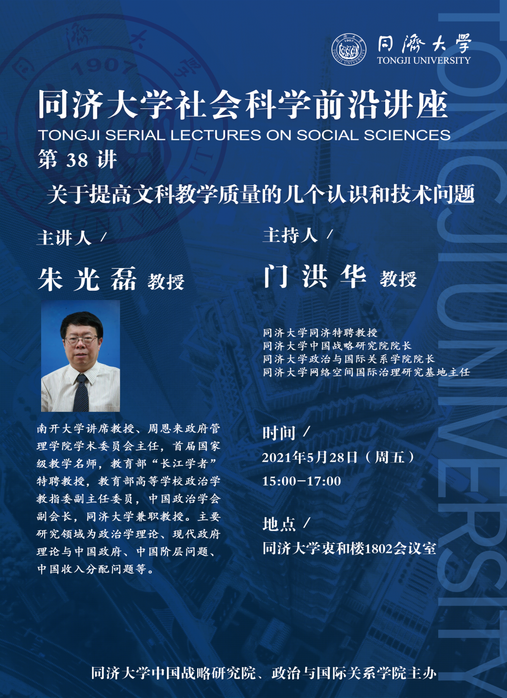Hosted by the School of Political Science & International Relations (SPSIR) and the Institute for China & World Studies of Tongji University, the Tongji Serial Lectures on Social Sciences No. 38 was successfully held in Conference Room 1802, Zhonghe Building, Tongji University on May 28, 2021. Prof. Zhu Guanglei, a chair professor at Nankai University, Director of the Academic Committee of Zhou Enlai School of Government, a distinguished professor of the Changjiang Scholars Program of MOE, and a winner of the National Famous Teacher Award (the first session), was specially invited to give a keynote speech on the topic of "Several Cognitive and Technical Issues on Improving the Quality of Liberal Education".